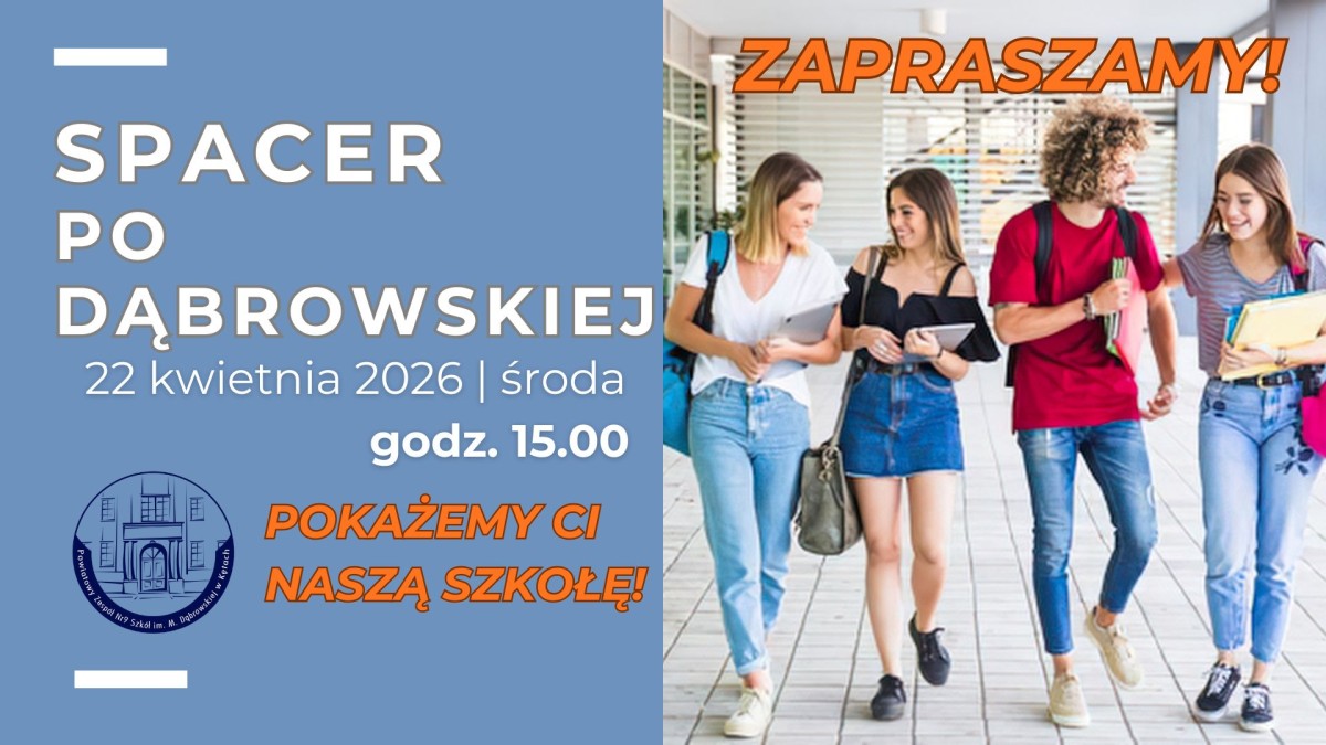 Kolejna środa, kolejny spacer po “Dąbrowskiej”. Ósmoklasisto, skorzystaj z szansy aby zobaczyć naszą szkołę, porozmawiać z jej uczennicami i uczniami. Zapraszamy w najbliższą środę, 22 kwietnia br. o godz. 15.00!