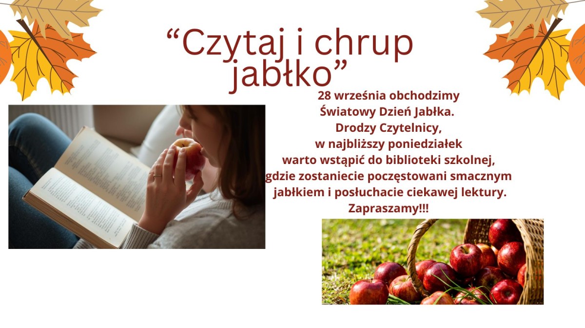 28 września obchodzimy Światowy Dzień Jabłka. Drodzy Czytelnicy, w najbliższy poniedziałek 29 września warto wstąpić do biblioteki szkolnej, gdzie zostaniecie poczęstowani smacznym jabłkiem i posłuchacie ciekawej lektury. Zapraszamy!!!